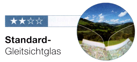 Das Standard-Gleitsichtglas ist ein günstiges Gleitsichtglas mit befriedigenden Abbildungseigenschaften. Noch deutlich spürbare Einschränkung des Sichtfeldes.